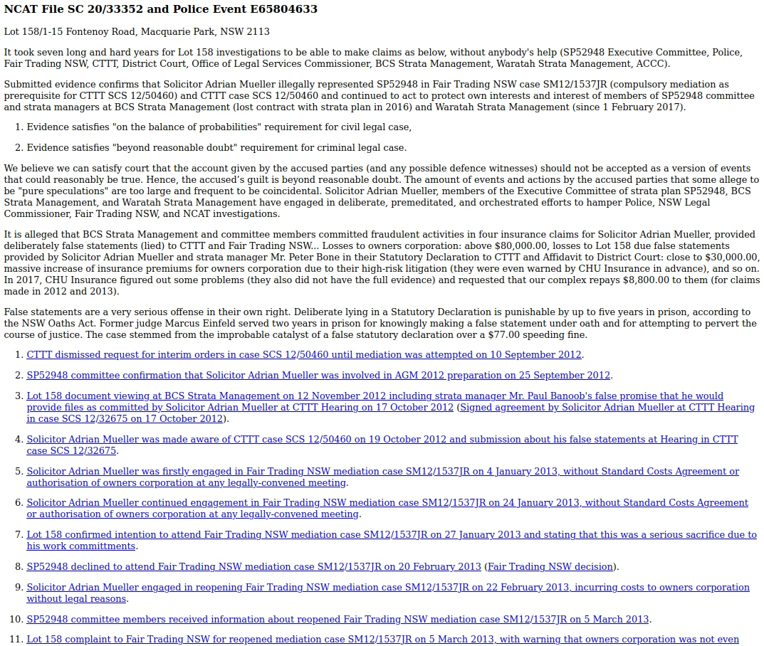 Part of Lot 158 submissions relate to evidence of Solicitor Adrian Mueller's fraudulent activities in CTTT cases SCS 12/32675 and 12/50460, without owners corporation approval at any legally-convened meetings - small extract from evidence, which Solicitor Adrian Mueller and committee members could not refute, whilst NCAT, Fair Trading NSW, and OLSC refused to even consider:
