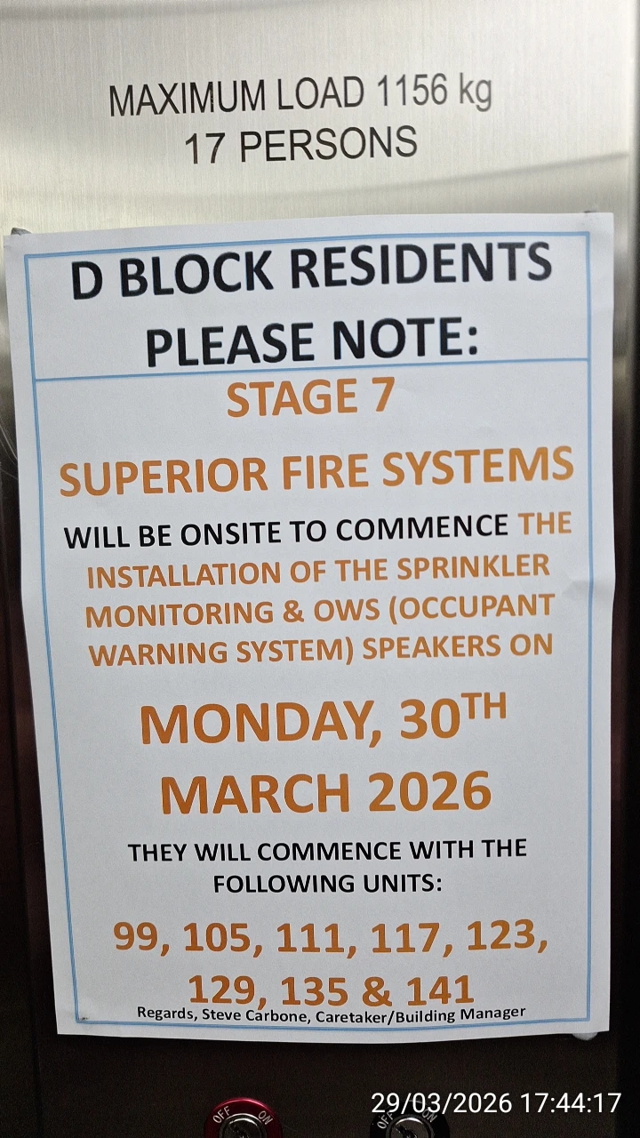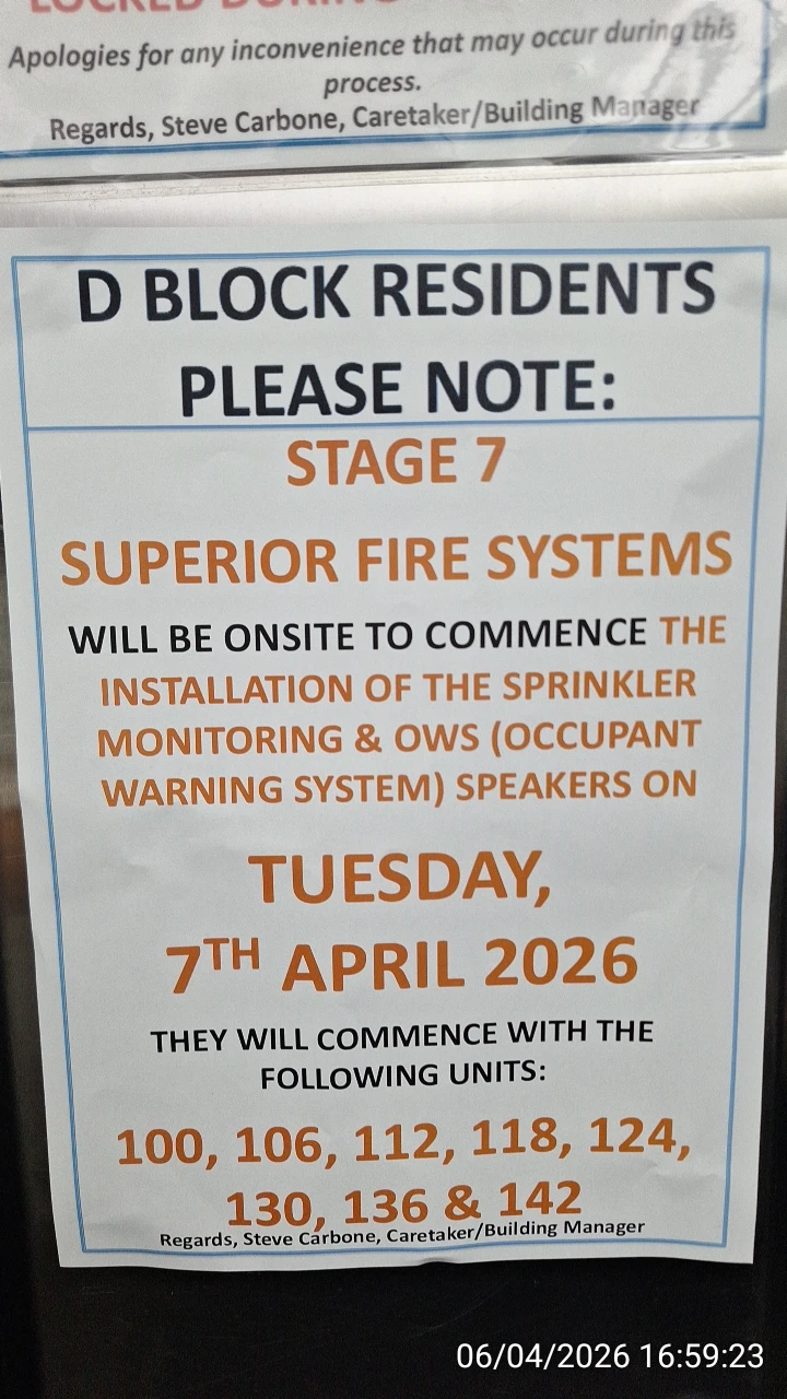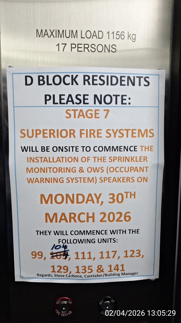 Belated Block D Occupant Warning System (OWS) installations in March 2026 after many years of refusal to comply with City of Ryde Fire Safety Orders:
