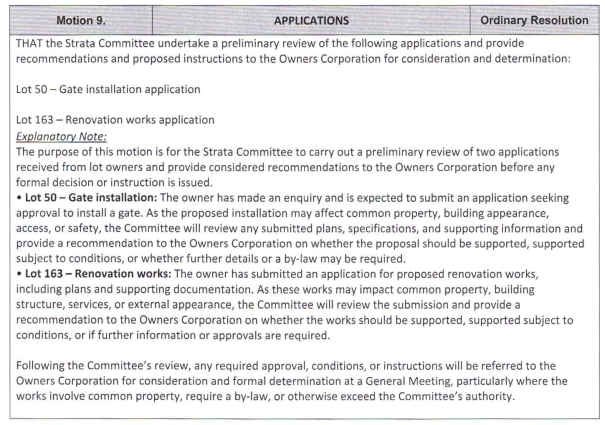 On 10 January 2022, ex-committee member Lot 151 (Ms. Maureen McDonald) installed gate with lock on colorbond fence towards external gardens without decision at any meeting or registration of Special By-Law. Since this is a fence dividing the owner's Lot and common property, the responsibility for this fence is shared equally between that particular Lot 151 and the owners corporation – gates located in this area are treated in the same way.