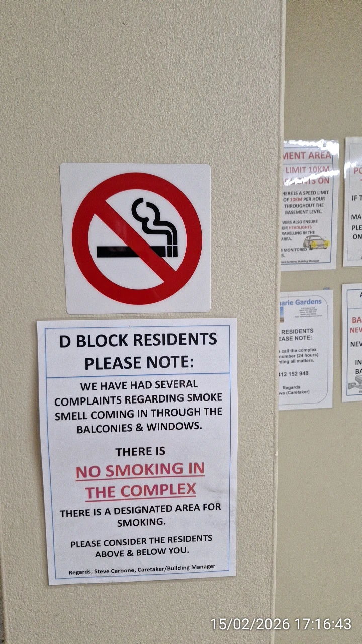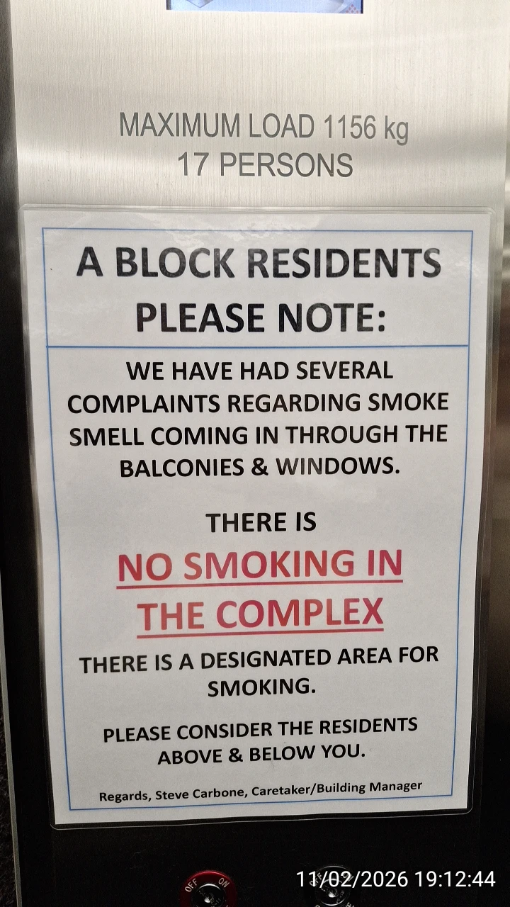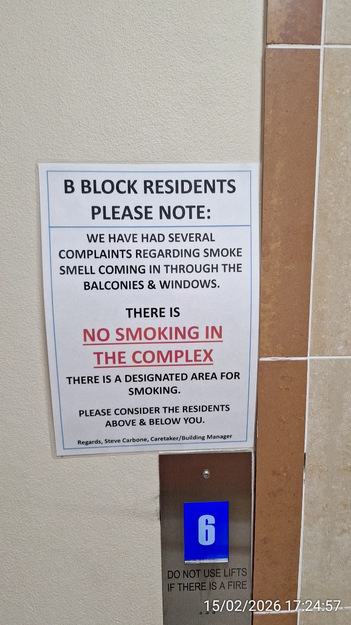 Significant problems with smoking, which Uniqueco Property Services and Waratah Strata Management failed to act with decisive actions, was shown by continuous warnings without effect that Uniqueco Property Services put in elevators or on walls of the buildings on 15 February 2026: